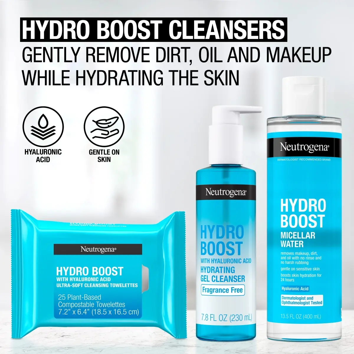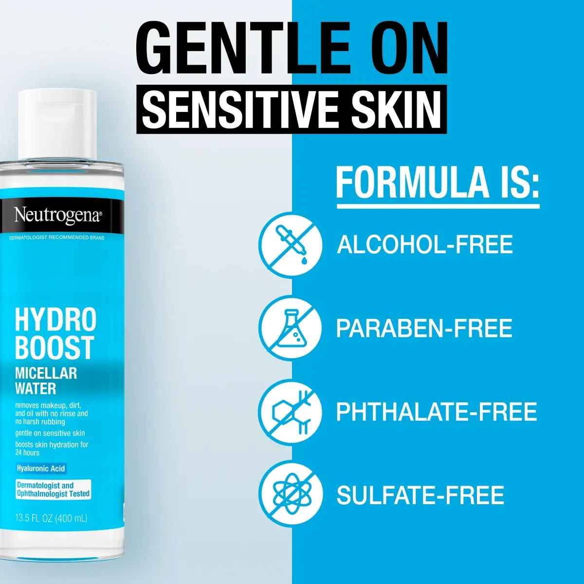 Neutrogena Hydro Boost Micellar Water gently removes makeup, dirt, and oil while hydrating sensitive skin. This dermatologist and ophthalmologist tested formula powered by three types of mi-cellar molecules, plus hyaluronic acid, lift away impurities without tugging and boost skin's moisture for 24 hours. Suitable for sensitive, dry skin, the micellar water is non-comedogenic, alcohol-free, and free from parabens, phthalates, and sulfates. It works as a no-rinse makeup remover and facial cleanser in one step—no harsh rubbing or rinsing needed. Use daily as part of your skin-care routine to reveal clean, soft, and refreshed skin. Simply apply with a cotton pad over the face and eyes.