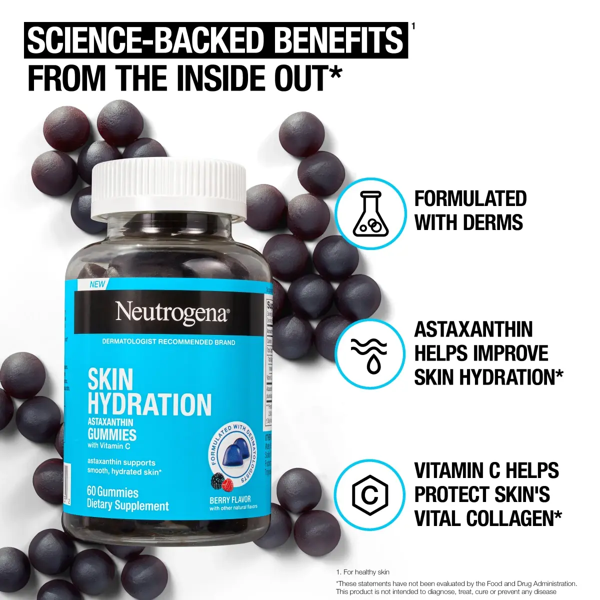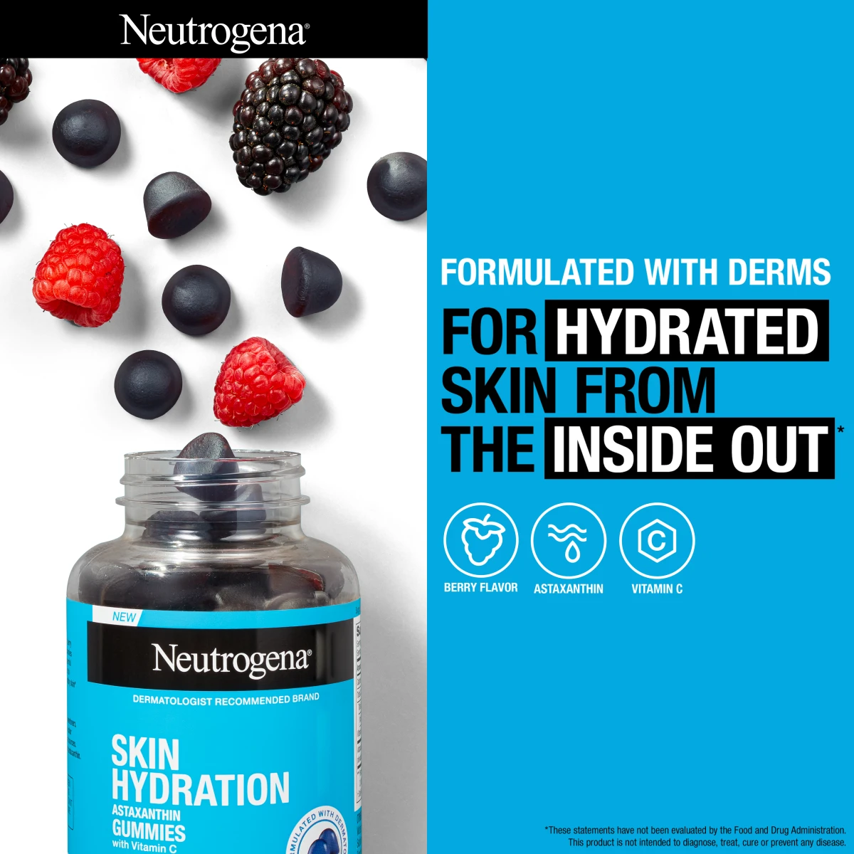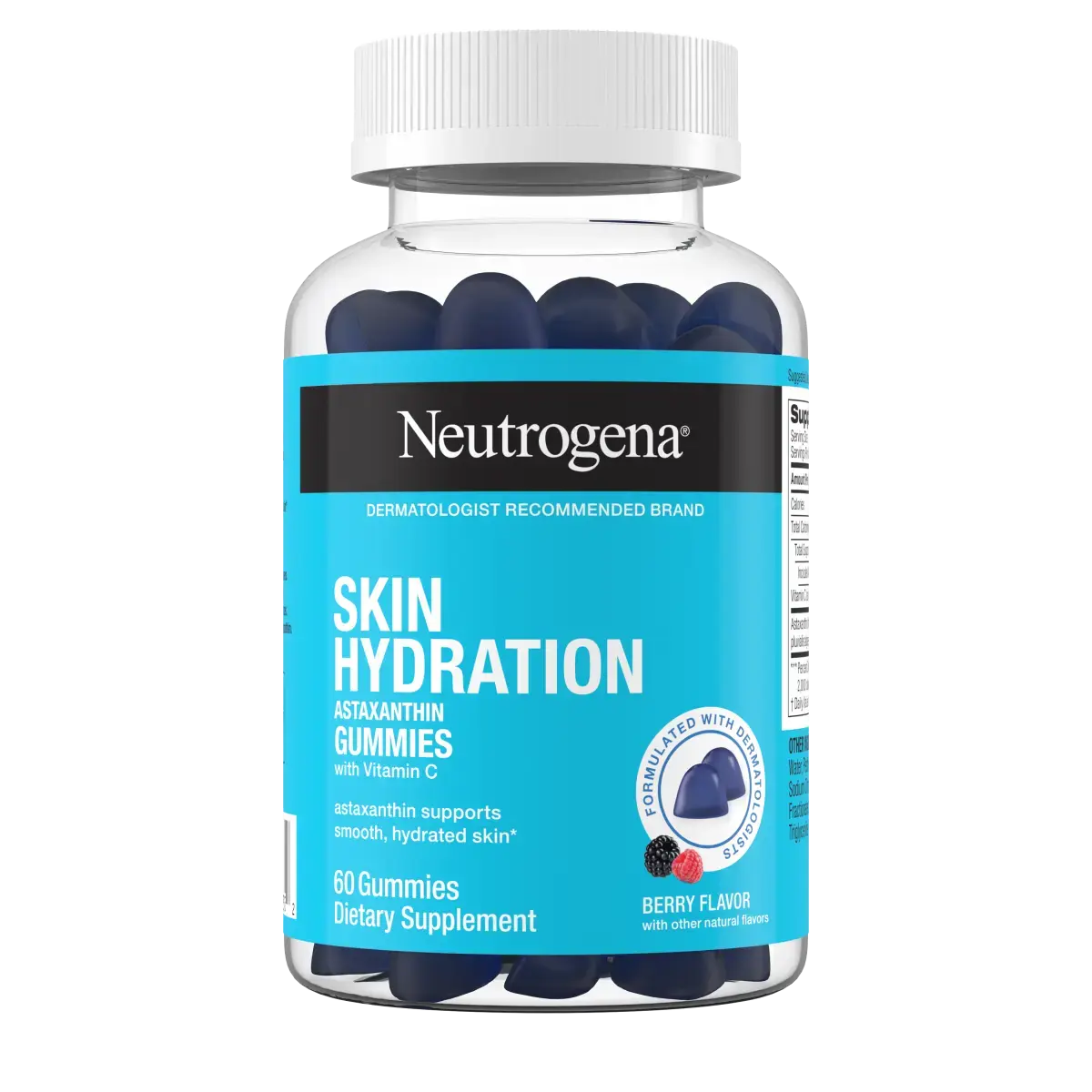 Protect skin at a cellular level by supporting its natural hydration with Neutrogena Skin Hydration Astaxanthin Gummies with Vitamin C. Formulated with dermatologists to support healthy, hydrated skin, these skin health gummies contain clinically tested, plant-based astaxanthin, a powerful antioxidant, and Vitamin C to help protect skin's vital collagen for smooth, healthy skin from the inside out.* These dietary supplements have a delicious berry flavor, are free of artificial sweeteners, and are made with colors and flavors from natural sources. Adults, chew two gummies daily for healthy skin, and reclose cap tightly after use. *These statements have not been evaluated by the Food and Drug Administration. This product is not intended to diagnose, treat, cure or prevent any disease.