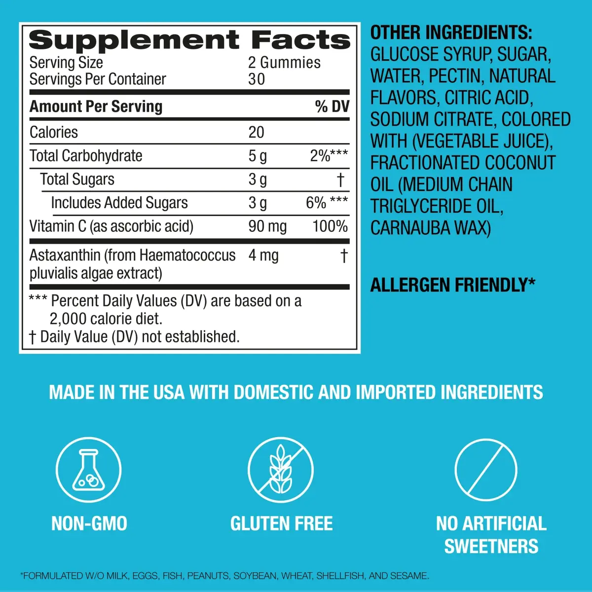 2 gummies daily provide 4mg of astaxanthin and 90mg(100% daily value) of Vitamin C (ascorbic acid).