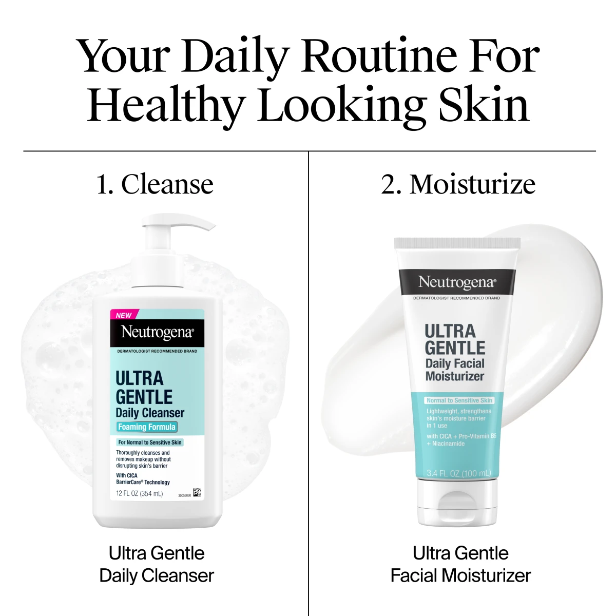 Neutrogena Ultra Gentle Foaming Daily Cleanser transforms into a gentle foam to thoroughly cleanse away dirt, oil, and makeup without disrupting skin’s dynamic barrier, for skin that feels soft, smooth, and refreshed.