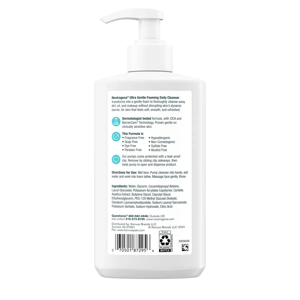Neutrogena Ultra Gentle Foaming Daily Cleanser is a gentle, fragrance-free face wash designed for sensitive skin. This facial cleanser removes dirt, oil, and makeup without over-drying or irritating skin. Formulated with CICA and BarrierCare Technology, it helps preserve your skin’s natural protective barrier while providing a soft, refreshed feel. Hypoallergenic and non-comedogenic, it won’t clog pores and is safe for daily use. Simply wet your face, pump a small amount into your hand, lather into a foam, massage gently onto skin, and rinse. From a dermatologist-recommended brand, this ultra-gentle cleanser supports a daily skincare routine that keeps sensitive skin clean, soft, and smooth.