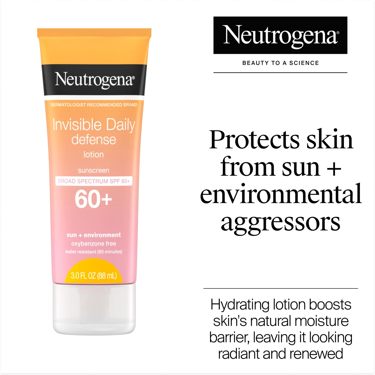 Help protect skin against the sun and environmental aggressors with Neutrogena Invisible Daily Defense Sunscreen Lotion. With SPF 60+ and Helioplex technology, this face and body sunscreen from the #1 dermatologist-recommended sun care brand helps prevent sunburn and provides broad spectrum UVA/UVB protection to help fight against signs of skin aging caused by UVA rays, such as wrinkles, dark spots, fine lines and sagging. The hydrating lotion boosts skin's natural moisture barrier, leaving it looking radiant and renewed. Formulated with antioxidants, the gentle sunscreen lotion also helps fight environmental aggressors such as cold, ozone, and pollution that can damage skin and lead to premature skin aging. The lightweight, quick-drying, non-comedogenic sunscreen rubs in invisibly on all skin tones without white marks and is oxybenzone-, paraben-, and mineral oil-free. Ideal for use during outdoor activities, the lotion is water- and sweat-resistant for up to 80 minutes.