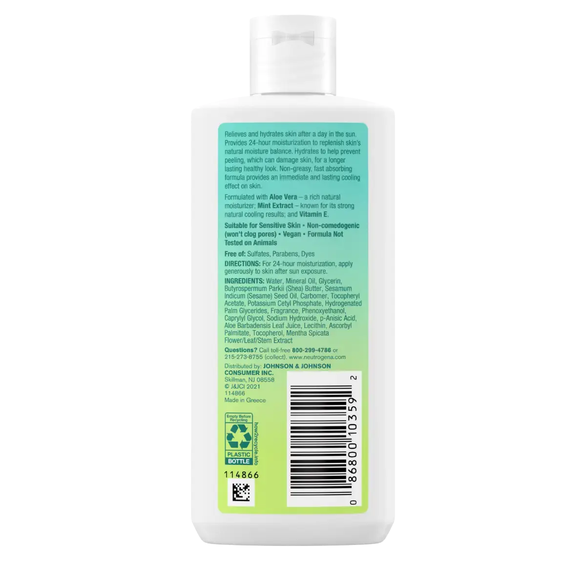 Revive and replenish skin after a day in the sun with Neutrogena Sun Rescue After Sun Replenishing Lotion. This after sun lotion from a dermatologist-recommended sun care brand provides 24-hour hydration to maintain the natural moisture balance of skin while helping to prevent peeling for healthier looking skin. Formulated with soothing aloe vera, mint extract, and vitamin E a know antioxidant, this rehydrating lotion is ideal for sensitive skin after sun exposure, and helps you maintain a longer lasting healthy look. Formula not tested on animals, the moisturizing lotion is paraben-free, sulfate-free, dye-free, vegan, and non-comedogenic. For visibly softer skin, apply hydrating lotion generously after a day in the sun.